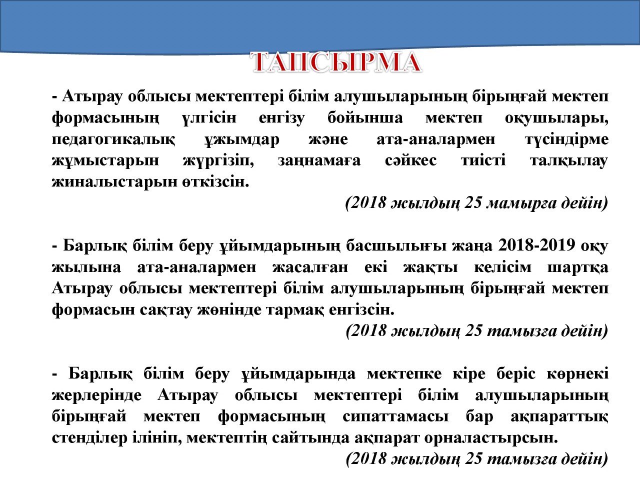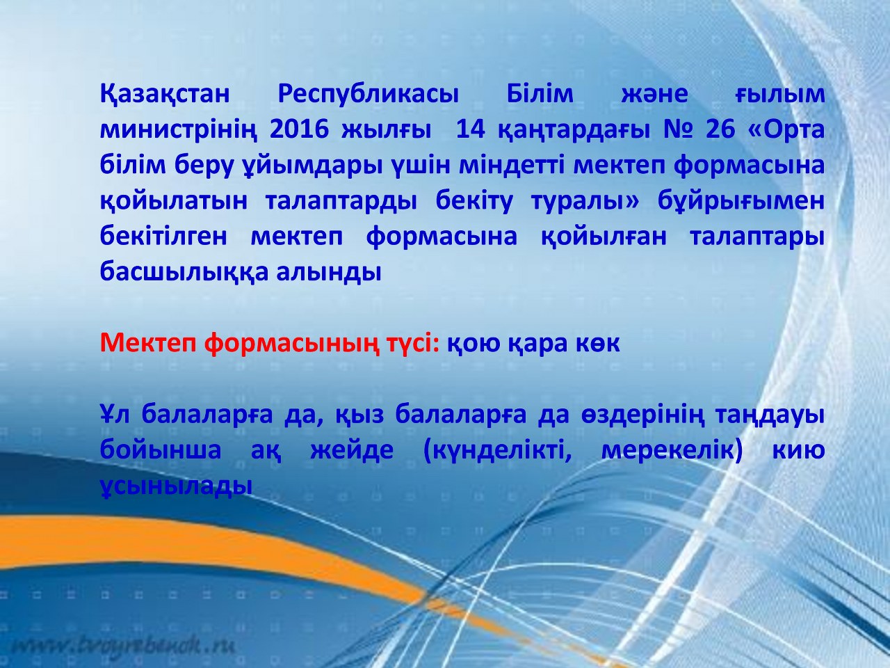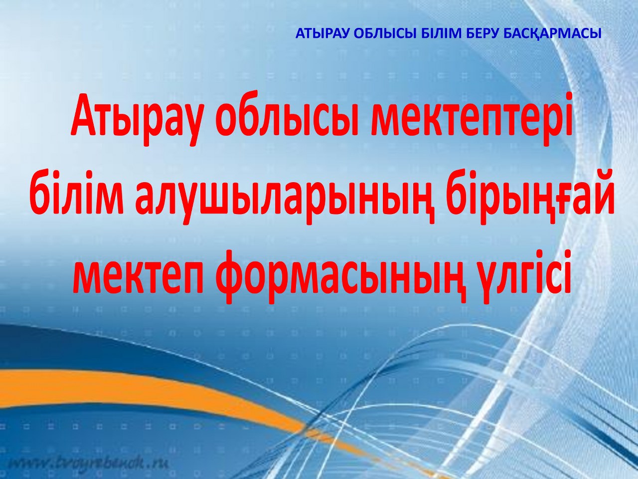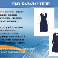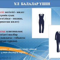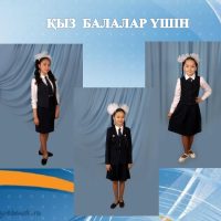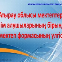 Атырау облысы білім беру басқармасының ұсынған мектеп киім үлгісі мектеп формасының түсі: қою қара көк. Ұл балаларға да, қыз балаларға да өздерінің таңдаулары бойынша ақ жейде (күнделікті, мерекелік). Ұл балалар үшін үсті: негізгі жилет (күннің суық мезгілінде – пиджак, трикотаж жилет). Асты: классикалық үлгідегі шалбар (ұзындығы – тобықты жауып тұрады). Қыз балалар үшін ақ бантик. Үсті: негізгі жилет (күннің суықты мезгілінде – пиджак, трикотаж жилет) Асты: үлгісі таңдауы бойынша етек (ұзындығы – тізе тұсында және тізеден 5 см-ге дейін жоғары не төмен болмауы керектігі) бірауыздан келісіліп, қабылдауға ұсынылсын.