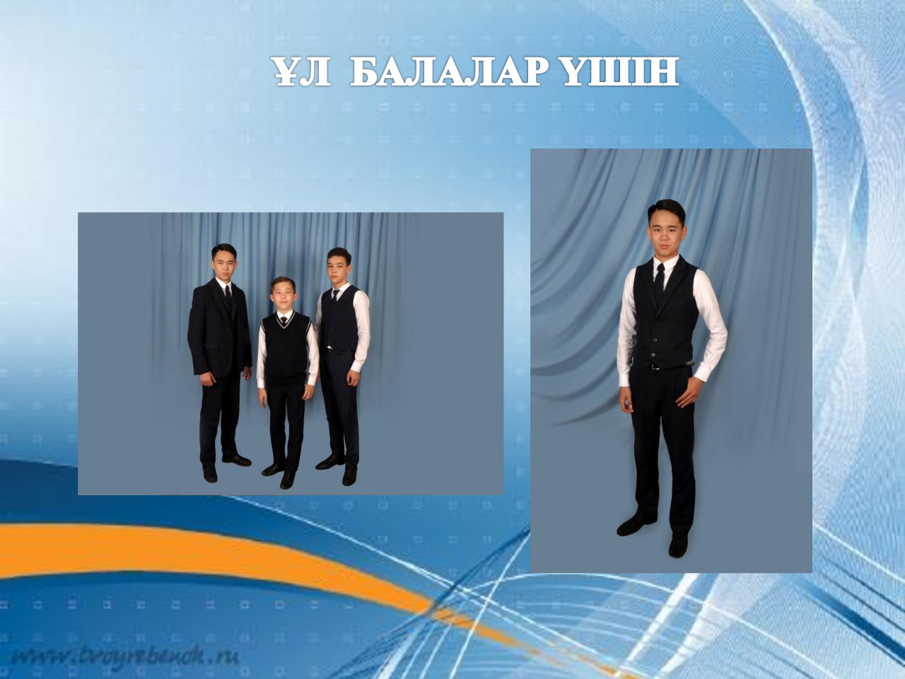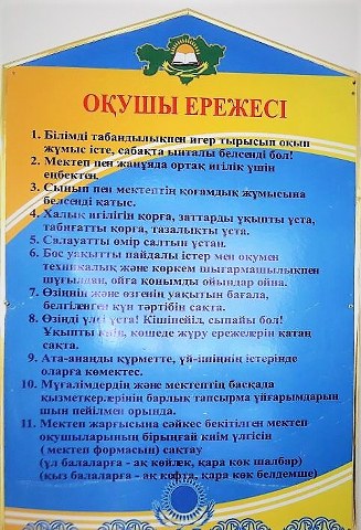 Ұлдар үшін мектеп формасы артқы бөлігі қара сол жағында оюы бар жакет. Ақ жейде, классикалық шалбар (қыс мезгілінде трикотаж жилет, водолазка). Ұлдарға арналған шалбарлар еркін тігілген және ұзындығы бойынша тобықты жауып тұру керек. Қыздардың мектеп формасы бір түстес көк сол жағында оюы бар жакет, ақ жейде, ақ бантик (қысқы уақытта трикотаж жилет сарафан, водолазка.) Қыздарға арналған юбка еркін тігілген және ұзындығы тізеден 10-12см төмен болуы тиіс).