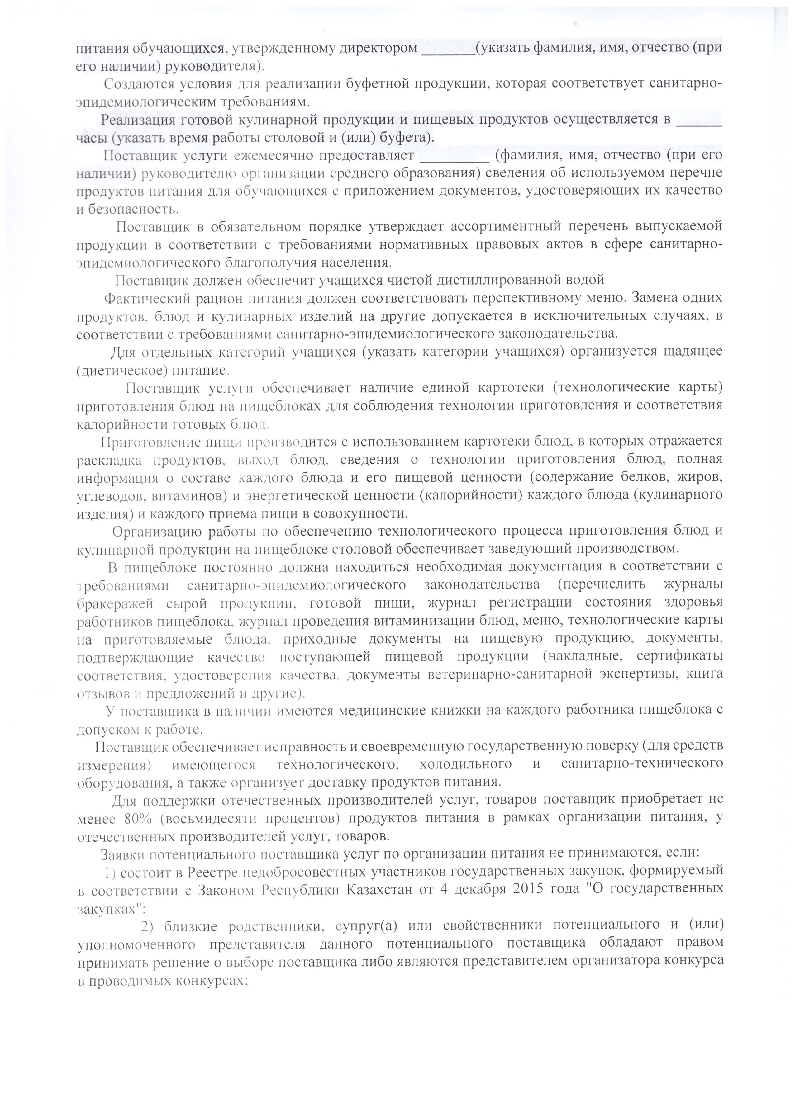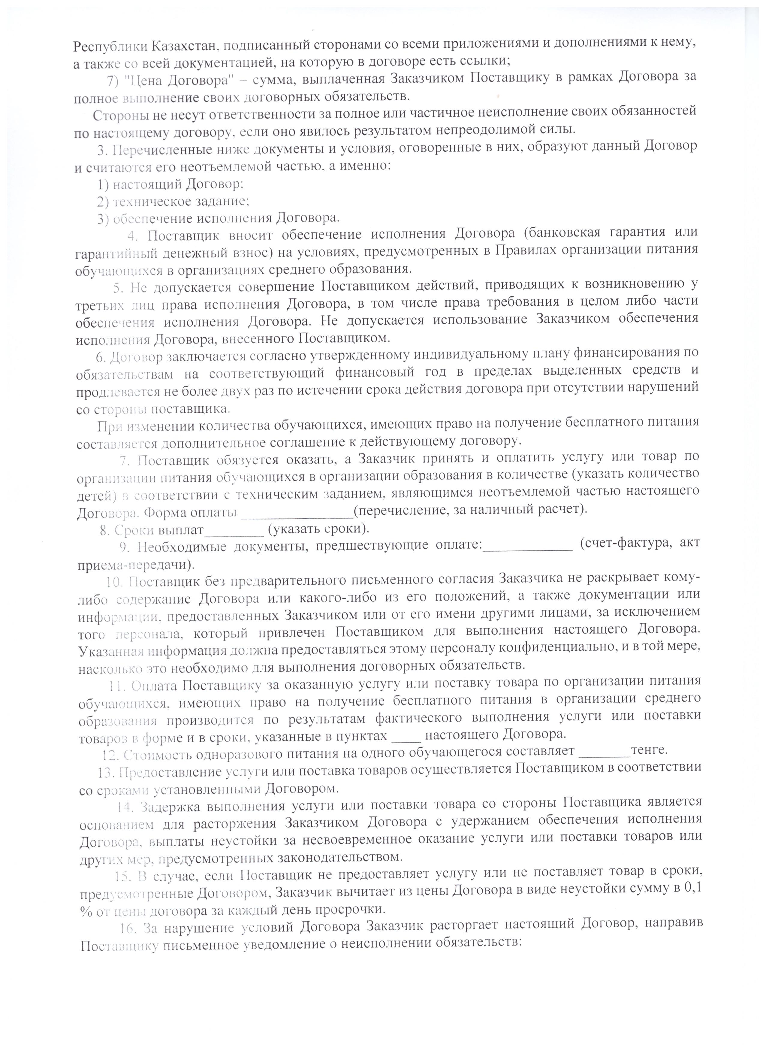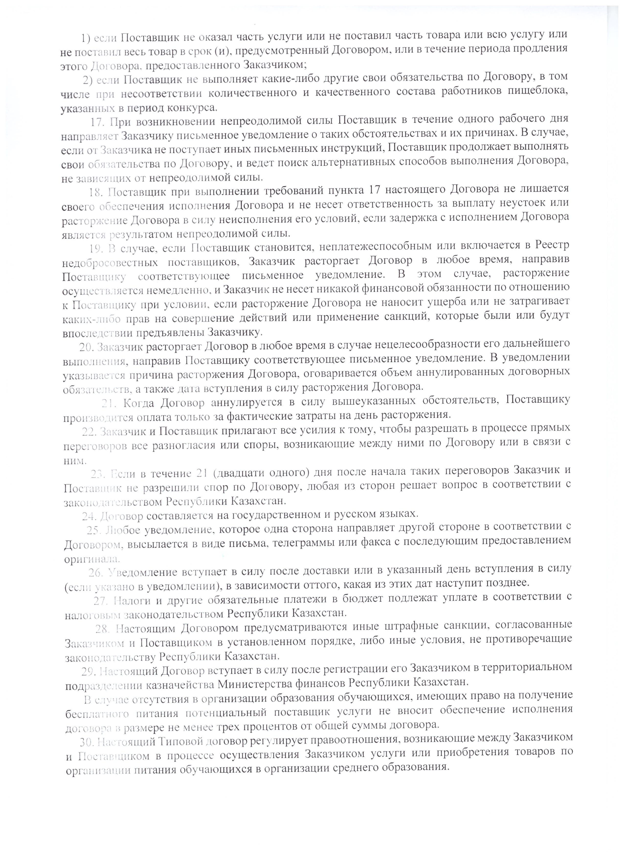 В случае нарушения или ненадлежащего исполнения условий договора поставщиком, договор расторгается в судебном порядке и данный поставщик объявляется недобросовестным (приказ МОН РК №599 от 31 октября 2018 года).
