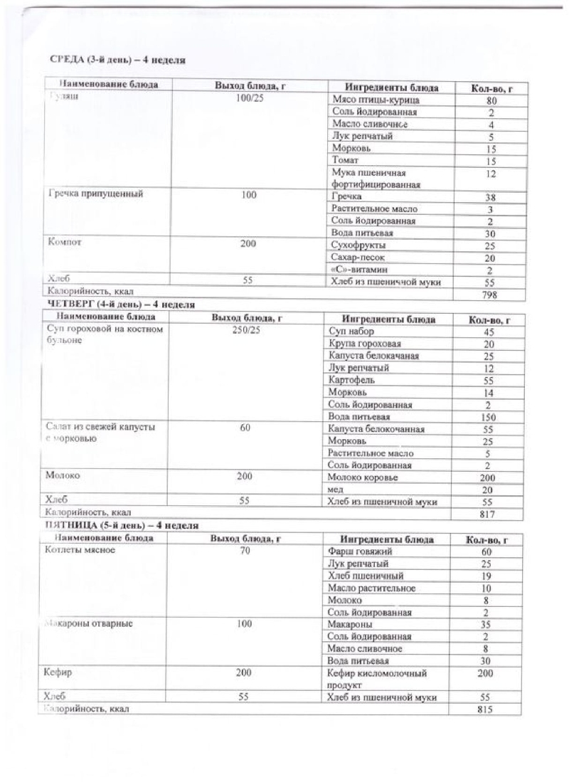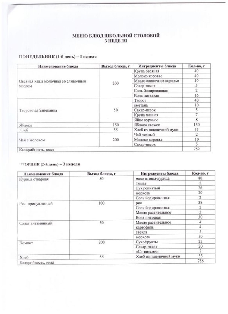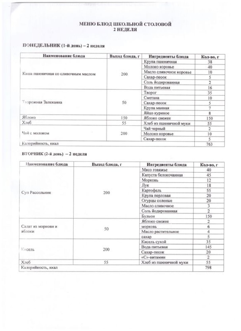 Меню блюд школьной столовой 1,2 неделя (лето-осень) 2018год